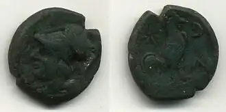 The coins of Suessa are closely related to those of other cities in the area in style, types, and production techniques;[28] silver coins with the types of Apollo on the obverse and Dioscurus on the reverse and bronze coins with three different types were minted in the city of Aurunci.[28][29]