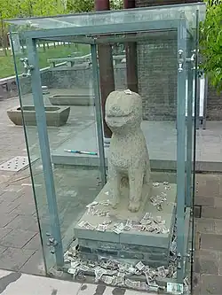 Many tourists proactively throw coins into any water-filled receptacle within scenic areas. Apart from designated wishing wells, fountains, water tanks, and fish ponds all become targets. This practice is not limited to religious sites like Buddhist temples and Taoist shrines; coins are also thrown in places where such acts of prayer are inappropriate, such as the pool in the Peace Park west of the Memorial Hall of the Victims in Nanjing Massacre by Japanese Invaders, the showcases of dinosaur fossil skeletons at the National Natural History Museum of China or of the Terra Cotta Warriors at the Shaanxi History Museum.[6][7]