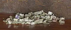 The Trevi Fountain in Rome is known for a custom where people toss coins for good luck. According to legend, throwing a coin into the Trevi Fountain ensures that travelers will return to Rome one day. Approximately €3,000 are thrown into the fountain each day.[24] In 2016, an estimated $1.5 million worth of coins were collected from the fountain.[25] These coins are used to fund a charity supermarket in Rome.[24] Attempts to retrieve the coins from the fountain are illegal, still, there were occasional efforts to do so.[24][26][27] There have been reports that the mayor of Rome once considered using the coins from the fountain to pay off the city's debts.[28][29]