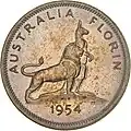 A lion and a kangaroo standing together on a curved ground line facing right, "AUSTRALIA FLORIN" above, below in exergue, "1954". Designed by William Leslie Bowles. | 1954 | 1954 | ||||||||