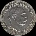100 K | 37.0 mm | 2.0 mm | 33.9 g | "BIZALMAM AZ ŐSI ERÉNYBEN", ornament | "FERENCZ JÓZSEF I.K.A.CS. ÉS M.H.S.D.O.AP.KIR.", standing I. Ferenc József | Middle Coat of Arms with angels, value, mintmark | 1907 | |