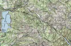 The Northern Pomos have a legend that water from Clear Lake once drained west through the Blue Lakes, then through Cold Creek into Coyote Valley and the Russian River. Then there was a great earthquake and a huge landslide blocked the flow out of Clear Lake. The land was forced up, and Clear Lake began to drain to the east through Cache Creek. This is plausible, since there have been tectonic events in the region and Clear Lake is 600 feet (180 m) higher than the Ukiah Valley.[10] The gradual mountain pass between Cold Creek basin and Upper Blue Lake is called Da-no lokj'tam, or "mountain fell-in", by the Northern Pomo.[11]