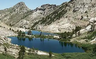 Cold Lakes are a pair of glacial tarns in the Ruby Mountains, in Elko County in the northeastern part of the state of Nevada.[1] They are located at the head of Cold Creek Canyon, at approximately 40°42.9′N 115°18.1′W / 40.7150°N 115.3017°W, and at an elevation of 9,880 feet (3,010 m). They have a combined area of approximately 7.4 acres (3.0 hectares), and a depth of up to 28 feet (8.5 m).