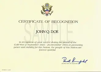 The Cold War Recognition Certificate was authorized by the United States Congress in 1997 to recognize "all members of the Armed Forces and qualified Federal government civilian personnel who faithfully and honorably served the United States during the Cold War Era from September 2, 1945, to December 26, 1991".[1] The Department of Defense designated the Department of the Army as the executive agent for the Cold War Recognition Certificate Program.[2]