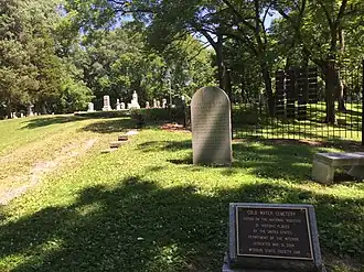 John Patterson (1760–1839), of Scotch-Irish descent, was a Revolutionary War veteran who had emigrated from North Carolina; in 1797 he received a Spanish land grant in Upper Louisiana.[2] There is conflicting information around the size of the original land grant, with estimates between 600 acres and 1500 acres. The cemetery began as a plot for the Patterson family, with the earliest burial estimated to be in 1809 for John Patterson's wife Keziah Horneday Patterson.[2] Around 1809, a log church was erected on the site, later the first location of Cold Water Church, now Salem Baptist Church. The church is no longer standing, but there is a memorial plaque.[2][1]