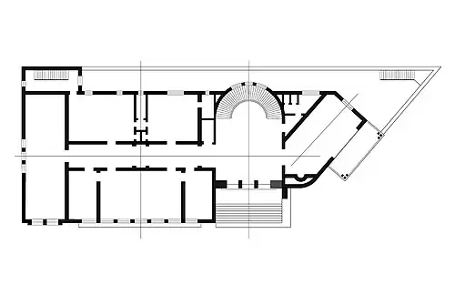 The circulation of the Colegio Nacional de Arquitectos building is through a double-loaded corridor. It was one of the first curtain walls to be used in Cuba.[4] The building consists of a semi-basement and two floors that houses offices, a library, recreation rooms, an auditorium, and a large spiral staircase that forms a large space on three levels which is illuminated by natural light from three panels of glass blocks. It has several outdoor porches. On the outside, coral stone and green Cuban marble are used. The main part of the building (auditorium) is covered by a gable roof, the rest of the building has a flat roof.