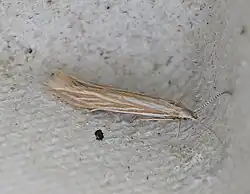 The wingspan is 9.5–13 mm.[2] The forewing is cream-coloured with distinct white longitudinal stripes and with oblique streaks and scattered fuscous scales. Certain identification requires examination of genitalia preparations. Adults are on wing in June and July.[3][4]