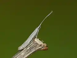 The wingspan is 10–12 mm. Coleophora species have narrow blunt to pointed forewings and a weakly defined tornus. The hindwings are narrow-elongate and very long-fringed. The upper surfaces have neither a discal spot nor transverse lines. Each abdomen segment of the abdomen has paired patches of tiny spines which show through the scales. The resting position is horizontal with the front end raised and the cilia give the hind tip a frayed and upturned look if the wings are rolled around the body. C. otidipennella characteristics include greyish appearance streaked with whitish-cream.It can only be reliably identified by dissection and microscopic examination of the genitalia.[1]