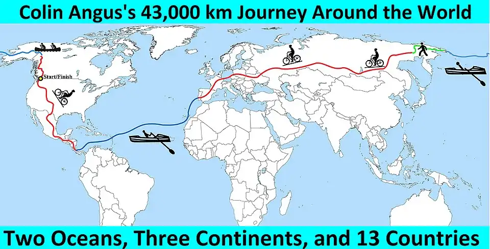 Angus traveled around the world using exclusively human power, walking and biking across land and rowing across water, completing his journey in May 2006. The expedition began with partner Tim Harvey. However, in Siberia the pair parted ways due to interpersonal conflict. Harvey continued and eventually circled the planet, but on a longer route than Angus, including Africa and South America [8]. Angus was joined bicycling in Europe by his then fiancée Julie Wafaei, who purchased a rowboat for them to cross the Atlantic. The British adventurer Jason Lewis, claims that Angus's journey was not a circumnavigation, because it did not pass through two antipodal points on the globe, although this is not required by Guinness World Records [9] Archived 2013-10-14 at the Wayback Machine.