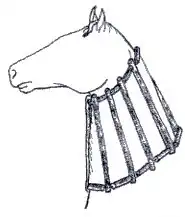 A collar designed to teach horses to tie up and to tie stallions at public events. It is constructed from double-stitched wide leather (sometimes fleece lined), with heavy duty dees sewn into each end. The collar is placed on a horse just behind the poll strap of a headcollar (headstall) which is used in conjunction, and a strong rope passes through the headcollar to secure the two dees so that the horse's wind is not impaired in any way. This manner of application will reduce the likelihood of the collar slipping and injuring or choking the horse. Sometimes used for tethering horses, they are expensive and are potentially dangerous if the horse should become entangled in the tether or frightened, etc.[10]
