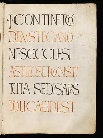 ![]() Folio 3r from Einsiedeln, Stiftsbibliothek, Codex 191 (277), showing a decorative title page for the Quesnelliana | |