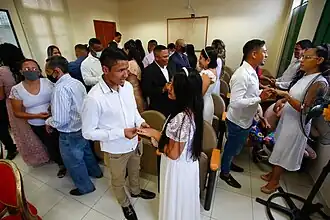 In the Philippines, mass civil or religious weddings are a common phenomenon, and are often sponsored by government and charitable groups as a form of public service.[6] Local politicians and sometimes celebrities participate as common wedding sponsors at such mass rites, which enable couples (and by extension their children) to benefit from formal state recognition of their unions.[7] Parish churches also regularly offer collective Nuptial Masses for their low-income congregants, at times in partnership with the secular government of that predominantly Catholic nation.[8]