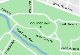 College Hall was the first building erected on the campus of the Agricultural College of the State of Michigan (now Michigan State University), and the first in the United States to be erected "for the teaching of scientific agriculture." Reputedly designed by John C. Holmes, it was built in 1856 and housed the school's classrooms, offices and laboratories, the school's library/museum, and a multifunction lecture hall/chapel. Along with Saints' Rest, and a horse barn, it was one of three buildings completed when the college opened for classes in 1857.