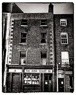 Number 6 College Street, a four-storey over basement red brick building, was built about 1820. A robe maker, Elizabeth Hawkins, traded in the premises in 1862.[12] In 1890 it became a retail shop to the bakery trade, called the Irish Yeast Company opened by a barrister Henry West.[13] The last owner, John Moreland, whose family acquired the shop in the 1930s, started working there in the 1940s when he left school and run the shop until it closed.[14] When Moreland, who lived above the shop, became ill in 2017 and the shop ceased operation. He died on 18 July 2017.[15] The building was sold in 2018 for €850,000 and the new owners, who own properties in Fleet Street whose buildings back onto College Street include a pub Bowe's. They applied for planning permission to enlarge Bowe's pub by incorporating the Irish Yeast Company premises but were refused because it would "seriously injure the special architectural and historic character and integrity."[16] A revised plan was again rejected in 2021 but Dublin County Council overruled An Bord Pleanála on 31 January 2024 by allowing the development of a "cafe/bar and reception area and three apartments in the late Georgian building that has been vacant since 2018 and is in a state of disrepair. Conservation and restoration are needed to this "a very important historic building" as noted by the Dublin County Council and An Bord Pleanála.[17]