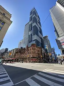 The intersection at Yonge Street is dominated by the landmark College Park complex, which once housed an Eaton's department store. This historic building is now used for retail, office, and residential purposes.