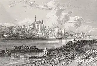 Saint Martin died in Candes on November 8, 397,[8] at the age of 81, while visiting the town to mediate a dispute within his diocese.[9] His death house became a pilgrimage site from the 5th century onward and appears to have remained intact until the 12th century. The original church,[Note 1][11] which he dedicated to Saint Maurice,[Note 2] was still standing at that time.[PAS 1] Although its exact location is unknown, it is believed to have been situated south of the present-day Collegiate Church of Saint-Martin.[13] Until the mid-9th century, the church was served by monks from a priory founded by Martin. They were later replaced by a chapter of twelve canons, documented around 1050,[14] at which point the Church of Saint-Maurice was elevated to the status of a collegiate church.[Bas 1]