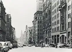 During the 1950s and 1960s, the street became subject to extensive redevelopment and many historic buildings were demolished by Whelan the Wrecker, despite the efforts of the National Trust and the Save Collins Street group.[9] While some examples of Boom Style architecture survive, the grandest examples were lost to the wrecker's ball.[10] Of the major losses, the most significant were the large Victorian buildings including the Federal Coffee Palace, Colonial Mutual Life building, Robb's buildings, Queen Victoria Buildings, City of Melbourne Bank, Scott's Hotel, Melbourne Mansions and APA building.[1] Many of the buildings destroyed in this era were documented by architectural photographer Mark Strizic and can be found in the archives of the State Library of Victoria.