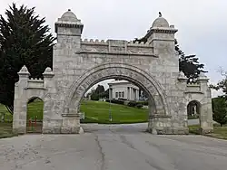 Colma became the site for numerous cemeteries after San Francisco outlawed new interments within its city limits in 1900, then evicted most existing cemeteries in 1912. In the 1910s, many of the roads to Colma were not maintained.[13] Bodies were transported by street cars in San Francisco down Valencia Street in the Mission District; which resulted in many mortuaries and funeral homes in this location for quick access to Colma.[13] Approximately 150,000 bodies were moved between 1920 and 1941, at a cost of $10 per grave and marker. Many of the remains in Colma came from the Lone Mountain Cemetery complex. Those for whom no one paid the fee were reburied in mass graves, and the markers were recycled in various San Francisco public works.[14] Some examples include drain gutters at Buena Vista Park and bolstering breakwater near the St. Francis Yacht Club. They can be seen at low tide on Ocean Beach.[14] The completion of the relocation was delayed until after World War II. The main rail line between San Francisco and San Jose running through Colma had been bypassed by the Bayshore Cutoff, completed in 1907 and providing a route closer to the San Francisco Bay shoreline, and the former main line was repurposed as a branch line to move coffins to Colma. Decades later, the right-of-way for the branch line through Colma was purchased by BART for use in the San Francisco International Airport extension project.[14]
