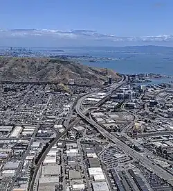 Colma Creek is a small creek that flows to the San Francisco Bay from its source in the Crocker Hills portion of San Bruno Mountain State and County Park, north of San Mateo County's Guadalupe Canyon Parkway,[3] with contribution from April Brook on San Bruno Mountain proper, south of the Parkway.[4] It flows southwest and makes a 90-degree bend in Daly City to flow southeastward, through Daly City, Colma, and South San Francisco to the bay. Its small delta is between South San Francisco and the San Francisco International Airport.[1]