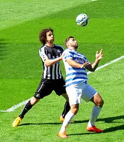 Despite Newcastle's relegation, Coloccini stayed on and was the mainstay of the club's defence all season, partnering the likes of Steven Taylor, Mike Williamson, Fitz Hall and Tamás Kádár in the sturdiest rearguard of the championship. He scored two goals for Newcastle since relegation, a header at Cardiff City,[8] and another header at Watford. The club was eventually promoted back to the Premier League as champions, and Coloccini's great contributions awarded him a place in the Championship's Team of the Year. Coloccini scored his third Newcastle goal against Wigan Athletic in the fourth minute of injury time as they came from two goals down to draw 2–2 at St James' Park, with that being his first goal in the Premier League on the same day that he captained Newcastle for the first time.[9] Coloccini scored a striker's finish in a 1–1 draw with Tottenham Hotspur on 22 January 2011, the day of his 29th birthday and his 100th Newcastle appearance.
