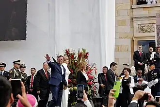 The inauguration procedure is governed by tradition rather than the Constitution, with the only constitutionally required procedure being the presidential oath. Traditionally, the president-elect and his family take a tour to the Plaza de Bolívar that begins at the San Carlos Palace.[8][9] After the presidential oath, the president goes to the Casa de Nariño where he is greeted by the outgoing president, who subsequently says goodbye to him.[10] [11] Usually then the president takes over some of the members of his cabinet.