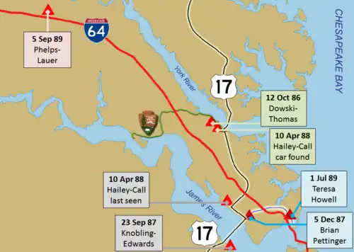 - ^ "Two women found slain in car off parkway near Yorktown". Danville Register and Bee. October 14, 1986. p. 3. Retrieved June 20, 2024.