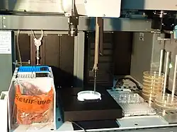 A colony picker is an instrument used to automatically identify microbial colonies growing on a solid medium, pick them and duplicate them either onto solid or liquid media. It is used in research laboratories as well as in industrial environments such as food testing and in microbiological cultures.