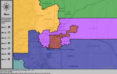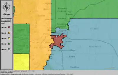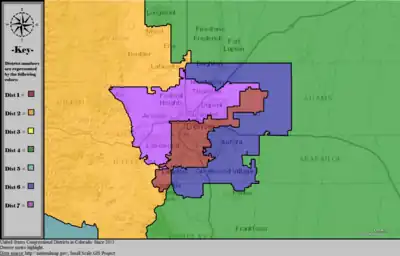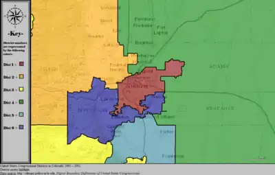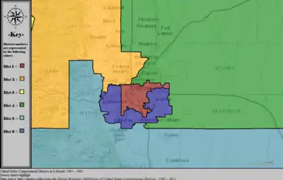Table of United States congressional district boundary maps in the state of Colorado, presented chronologically.[7] All redistricting events that took place in Colorado between 1973 and 2013 are shown.