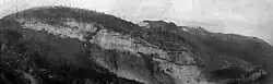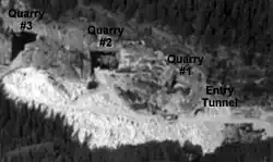 1905 development started the first of three quarry openings with #2 in 1905. When Quarry 2 cutting started, none of the workers wanted to hang off the edge of the cliff sitting on a wooden bench attached to an overhead derrick. So the company president, Channing Meek, came up to the quarry, sat on the wooden bench, was lowered over the mountainside, and started cutting marble. After that no worker refused to go over the side and cut marble. Quarry 2 was followed by #3 in 1907 and #1 in 1912. A fourth opening to the left of #3 (out of view) was started but did not become a producing quarry.[5]
