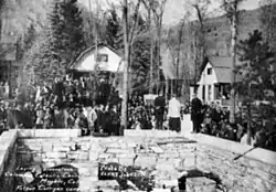 The civic-mindedness of the workers and the company is demonstrated through their donations to build the all-marble Columbus Catholic Church in Marble (on Park Street, between West 3rd Street and West 2nd Street). The company was donating the marble and the workers their time to quarry and cut it and build the church. The foundation was laid and a cornerstone ceremony was held in 1912. However, the quarrying stopped in August 1912 when company president Channing Meek died of injuries received from an electric tram accident on the quarry road and his successor did not want to continue the marble donation. Today, much of the foundation is still present as is the cabin across the street to the right.[3][5]