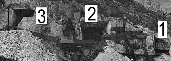 By 1914 the quarry configuration had gone through several changes but from then on remained largely unchanged until the shut down in 1941. Several buildings located to the right of opening 1 had been relocated to opening 3, such as the machine shop (first building to the left of opening 2), offices (to the left of the machine shop), and the compressor house (first building on the right of opening 2 and left of the boiler house). The boarding house (not visible to the right of opening 1) was also relocated. In 1910, a new system was finished to get the stone from the quarry down to the finishing mill in the town of Marble. Two tall wooden derricks (one to the left opening 2 and another on the east side of Yule Creek) suspended an 880 feet (270 m) long cable. The 50-ton (49.875 metric ton) electric hoist attached a block to the cable for lowering marble 225 feet (69 m) to the new loading station and onto a railroad car (on standard gauge track) towed by the new electric tram finished in 1910. The electric tram replaced the Pea Vine. After closing in October 1941, the equipment inside was removed and the wood structures fell apart.[4][5]