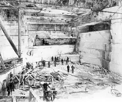 Lifting out of the quarry required a hole to be made through the block so a cable could be inserted to pull the block away so other cables could be attached for lifting out of the quarry. The lifting was done with wooden derricks above and outside of the quarry or the 50-ton electric hoist if in Quarry 2 (which was Quarry 3 during the boom period of 1905 to 1916).[3][5]
