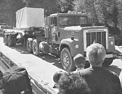 Once out of the quarry, a block was moved to a loading station for transport to the mill site. The first method (1906 through 1909) used the 50-ton electric hoist, which lowered the block down and onto a Pea Vine cable-powered cart. The cart then moved on rails with downgrades to 54% to a loading station where the block was transferred to a wagon for towing to the mill site. The wagons were first towed by teams of four horses then in 1908 by a 110-horsepower steam tractor previously used for logging. The road to the mill site was built in the 1890s by John Osgood to his quarry, which was just below the CYMC started quarry. By 1910, the method changed with the 50-ton hoist attaching a block to an overhead cable for lowering 225 feet (69 m) to a new loading station. Here the block was placed on a flatcar for towing by an electric tram (designed by General Electric) on standard-gauge railroad track to the town of Marble and into the mill site. Electricity to power the tram came from the CYMC-built hydro-electric plant located just east of the town.[3][5]