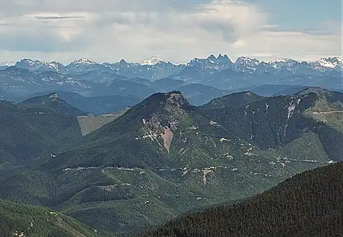 Colquhoun Peak is a 5,173-foot-elevation (1,577-meter) mountain summit located in the southeast corner of King County in Washington state.[3] It is set on land managed by Mount Baker-Snoqualmie National Forest. It is situated 3.1 mi (5.0 km) southeast of Kelly Butte and three miles west of the crest of the Cascade Range. Precipitation runoff from Colquhoun Peak drains into tributaries of the Greenwater River. Topographic relief is significant as the summit rises nearly 2,800 feet (850 meters) above the river in 1.5 mile. It once hosted a fire lookout tower.