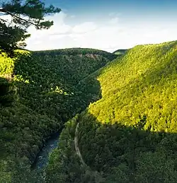 The gorge is also protected by the state of Pennsylvania as the 12,163-acre (4,922 ha) Pine Creek Gorge Natural Area, which is the second largest State Natural Area in Pennsylvania.[41][42] Within this area, 699 acres (283 ha) of Colton Point and Leonard Harrison State Parks are designated a State Park Natural Area.[43] The state Natural Area runs along Pine Creek from Darling Run in the north (just below Ansonia) to Jerry Run in the south (just above Blackwell). It is approximately 12 miles (19 km) long and 2 miles (3 km) wide, with state forest roads providing all of the western border and part of the eastern border.[44]