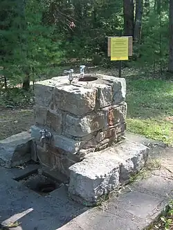 The park has five CCC-built picnic shelters: pavilions 1, 3, and 4 are made of stone and timber with stone fireplaces, while pavilions 2 and 5 each has log columns that support a pyramidal roof. The CCC also built six rustic latrines with clapboard siding and gable roofs, and an underground reservoir that is covered with a low hipped roof. Additional structures constructed by the CCC include three overlooks and a rectangular gable-roofed maintenance building with wane edge siding and exposed rafters made of logs. The structures built by the CCC are noteworthy in that they exemplify the rustic style of construction that was prevalent at national and state parks built during the Great Depression. Workers used locally found, natural materials in construction that blended with the natural surroundings.[9][21] Not all of the CCC's work has survived. A concession stand was built by the CCC and sold food and souvenirs from the late 1930s to at least 1953,[27] but was not listed on the 1986 NRHP nomination form. The CCC also built a brick and stone incinerator, but it is in ruins now.[21]