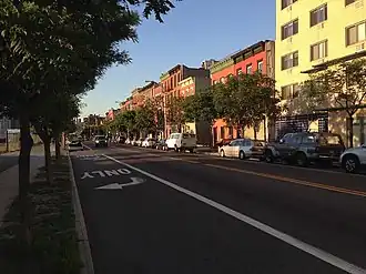 The Columbia Street Waterfront District is a neighborhood in the borough of Brooklyn in New York City on the Upper New York Bay waterfront between Cobble Hill and Red Hook and situated on the western side of the Brooklyn–Queens Expressway (BQE). The neighborhood is locally governed by Brooklyn Community Board 6. The neighborhood was formed in 1957 when the newly built BQE effectively cut Columbia Street off from Carroll Gardens and Cobble Hill, its two adjacent neighborhoods.[1] The district, once an area that was blighted by empty storefronts, was further emptied of tenants by a 1975 accident, while a sewer line was being repaired, that caused the death of a construction worker[2] and the demolition of 33 buildings.[3] By 1984, an urban renewal project was completed, as well as a brand-new street, houses along which sold out quickly.[4]