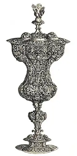 Columbine cups were first produced in Nuremberg in the sixteenth century, often as masterpieces to demonstrate the skills required to enter a craft guild.[2] They are first mentioned in 1513[3] and from 1531 to 1572 were the most important of three items that apprentices were required to submit to the guild in order to move up from journeyman to master status. The others were a gold ring set with a precious stone and a die for a steel seal.[4]