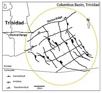 The Columbus Basin is a foreland basin located off the south eastern coast of Trinidad within the East Venezuela Basin (EVB). Due to the intensive deformation occurring along the Caribbean and South American plates in this region, the basin has a unique structural and stratigraphic relationship. The Columbus Basin has been a prime area for hydrocarbon exploration and production as its structures, sediments and burial history provide ideal conditions for generation and storage of hydrocarbon reserves. The Columbus Basin serves as a depocenter for the Orinoco River delta, where it is infilled with 15 km of fluvio-deltaic sediment.[1] The area has also been extensively deformed by series of north west to southeast normal faults and northeast to southwest trending anticline structures.[2]