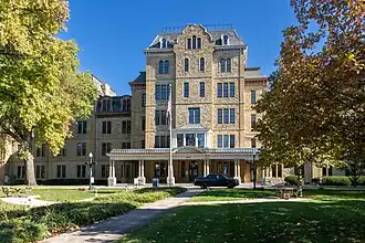 The campus has numerous smaller structures, including a large parking garage and two former dormitory buildings. The North and South Dormitories were constructed in 1935 to house students in the blind school. The north building held boys, while the south held girls, and each held 132 students and four matrons. The Jacobethan Revival buildings were designed by John Schooley Sr. The south dormitory building was proposed for demolition in September 2021, to make room for a surface-level parking lot.[5] Funding was removed for the demolition project in November, after a unanimous Columbus City Council vote.[6] In 2022, the building was listed as one of nine endangered buildings, in an annual Columbus Landmarks publication.[7]