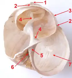 Shell of Helix pomatia with a part of shell removed; (4) the columella