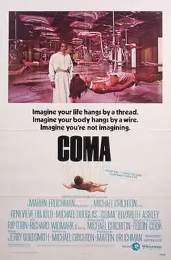 Coma is a 1978 American mystery thriller film based on the 1977 novel of the same name by Robin Cook. The film rights were acquired by director Michael Crichton, who also wrote the screenplay, and the movie was produced by Martin Erlichmann for Metro-Goldwyn-Mayer. The cast includes Geneviève Bujold, Michael Douglas, Elizabeth Ashley, Richard Widmark, and Rip Torn. Among the actors in smaller roles are Tom Selleck, Lois Chiles, and Ed Harris.