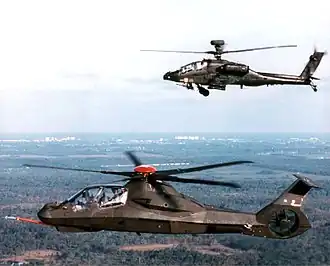 During 1982, the U.S. Army initiated the Light Helicopter Experimental (LHX) program with the aim of producing a replacement for several existing rotorcraft, including the UH-1, AH-1, OH-6, and OH-58 helicopters.[1][2] Then in 1988 a formal request for proposal (RFP) was issued to various manufacturers; the requirement had evolved into a battlefield reconnaissance helicopter by this time.[2] In October 1988, the Army announced two teams, these being Boeing–Sikorsky and Bell–McDonnell Douglas, received contracts to further develop their concepts.[3] During the 1990s, the program's name was changed from LHX to simply Light Helicopter (LH).[4] In April 1991, the Army awarded the Boeing–Sikorsky team a $2.8 billion contract to complete six prototypes.[5] Later that month the helicopter was officially named RAH-66 Comanche.[4]