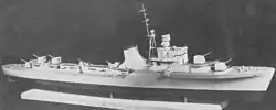 The ships would have been equipped with six 533-millimeter (21 in) torpedo tubes for SI 270 torpedoes in two triple mounts amidships.[3] Possessing a 270-kilogram (595 lb) warhead, the torpedo had ranges of 4,000 meters (4,374 yd) at 46 knots (85 km/h; 53 mph) and 12,000 meters (13,123 yd) at 29 knots (54 km/h; 33 mph).[9] The Italians intended to provide them with a sonar system of an unknown type for anti-submarine work. They would have been fitted with a pair of depth charge throwers and 64 depth charges.[3] The Comandanti Medaglie d'Oros would have been able carry 52 mines as well.[10]