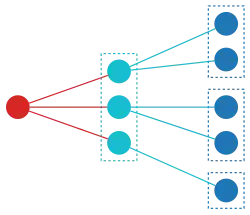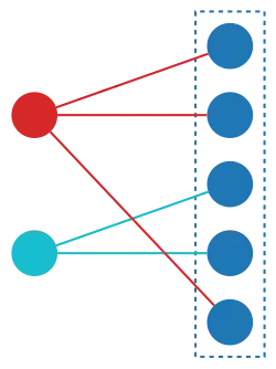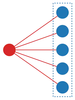 For example, the "species of permutations"[4] maps each finite set A to the set S[A] of all permutations of A (all ways of ordering A into a list), and each bijection f from A to another set B naturally induces a bijection (a relabeling) taking each permutation of A to a corresponding permutation of B, namely a bijection . Similarly, the "species of partitions" can be defined by assigning to each finite set the set of all its partitions, and the "power set species" assigns to each finite set its power set. The adjacent diagram shows a structure (represented by a red dot) built on a set of five distinct elements (represented by blue dots); a corresponding structure could be built out of any five elements.