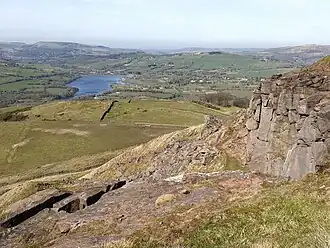 The reservoir is overlooked by Eccles Pike hill from the north and from the south by the Iron Age promontory hillfort Castle Naze, at the northern end of Combs Moss. Castle Naze is a protected Scheduled monument.[4]