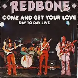 "Come and Get Your Love" is a song by the American rock band Redbone.[4] The song was originally released as a promo track under the name "Hail" and was later featured on their fifth album, Wovoka (1973), under its current name. The song was released as the album's first single the following year. Written and produced by band members Pat and Lolly Vegas, it is one of the band's most successful singles. It made them the first Native American band to reach the top five on the US Billboard Hot 100, reaching number five.[5]