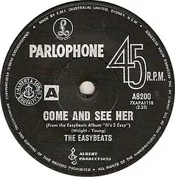 The Easybeats had formed in 1964 in Sydney by Dick Diamonde on bass guitar, Gordon "Snowy" Fleet on drums, Harry Vanda on lead guitar, Stevie Wright on lead vocals and George Young on lead guitar.[1][2] Their second studio album, It's 2 Easy (March 1966), was produced by Ted Albert for Parlophone Records/Albert Productions.[1] "Come and See Her" was released as the album's fourth single in April, which charted at No. 1 in Sydney and No. 10 in Melbourne – this was back-calculated in 2005 to be the equivalent of No. 3 on the national singles chart.[1][2][3] The track was co-written by group members Wright and Young.[4] Garry Raffaele of The Canberra Times referred to this song when reviewing their extended play, Easyfever (August), "They have turned away from the vocal gimmicks of numbers like 'Come and See Her' and concentrated on normal harmonies and relatively good arrangements."[5] It was the group's debut single in the United Kingdom, appearing on United Artists Records in July.[6]