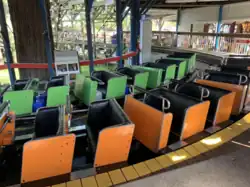 Comet has two Junior PTC trains of four cars, all of which utilize flanged wheels. Each car has two seats that can hold two riders, for a maximum of 16 riders per train.[2] Although the park owns two trains, for several years, only one was placed into daily operation, as park management was not comfortable running two trains with manually operated skid brakes.