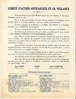 The Watchfulness Committee of Antifascist Intellectuals (Comité de vigilance des intellectuels antifascistes, CVIA) was a French socialist organization created in March 1934, in the wake of the February 6, 1934 riots organized by far right leagues, which had led to the fall of the second Cartel des gauches (Left-Wing Coalition) government. Founded by Pierre Gérôme, philosopher Alain, physicist Paul Langevin and ethnologist Paul Rivet, it edited a newsletter, Vigilance, and boasted more than 6,000 members at the end of 1934.